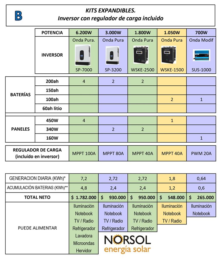 En las tablas A y B, cada columna corresponde a un KIT FOTOVOLTAICO con sus componentes: inversor, paneles, baterías y regulador de carga. Además se indica la Potencia máxima (W), Energía diaria (Kwh), Valor ($), y una referencia de los aparatos que puede alimentar. |